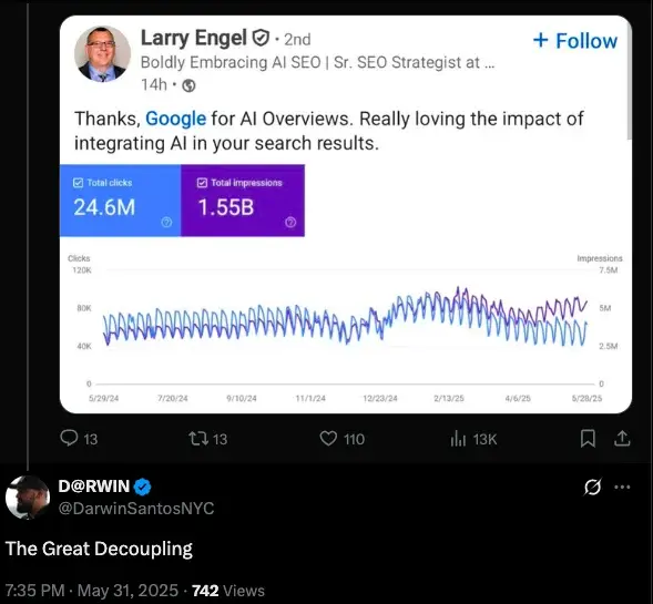 Industry experts quickly identified the core challenge presented by AI Overviews. The phenomenon was first labeled “The Great Decoupling” by Darwin Santos on X (formerly Twitter), a term since acknowledged by Google’s own team.